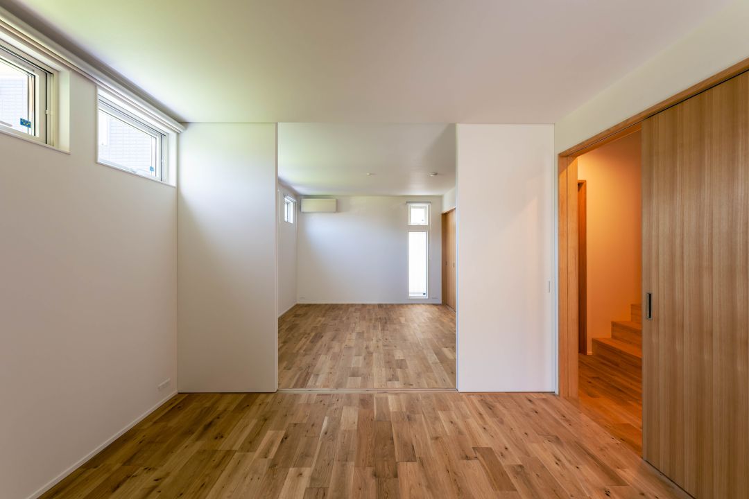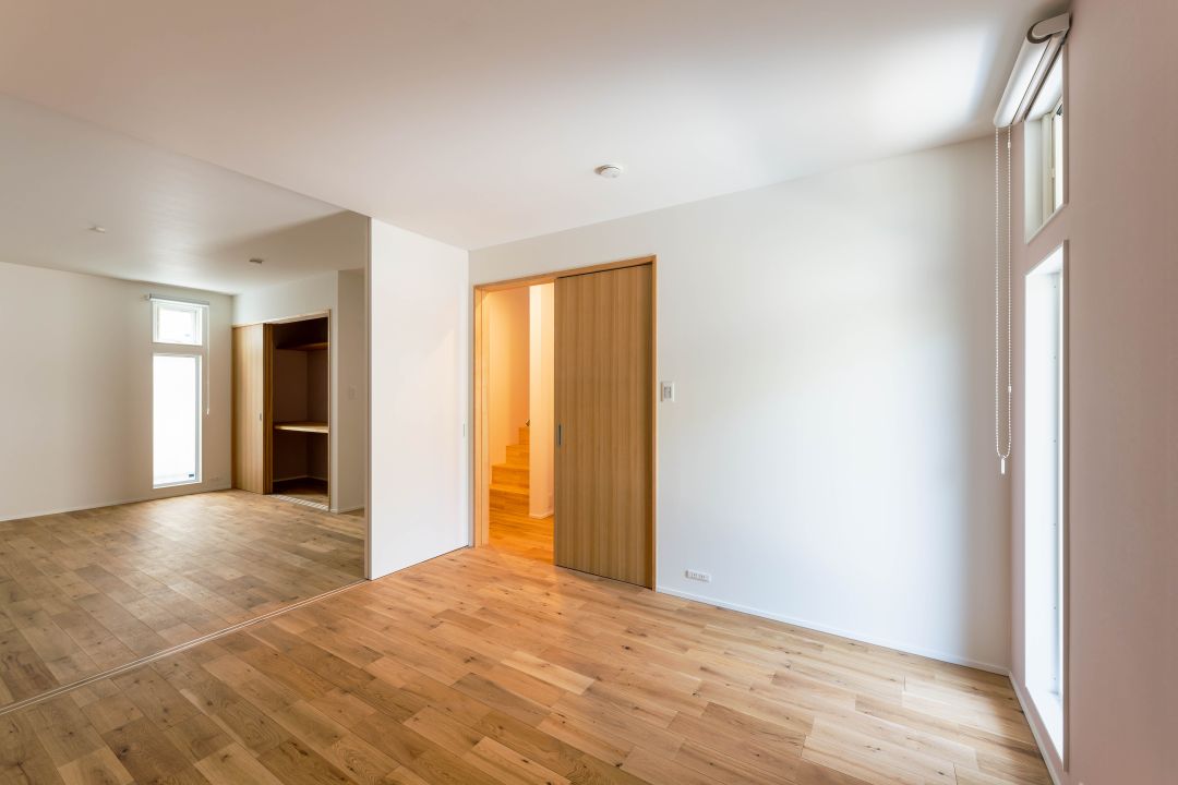 1階の大きな洋室。家族の変化に合わせて部屋を2つに分けられるよう、真ん中に間仕切りを作りました。たとえばお子様の成長に合わせて、主寝室+子ども部屋、子ども部屋+子ども部屋、ご夫婦それぞれの寝室、という具合にフレキシブルに使えます。