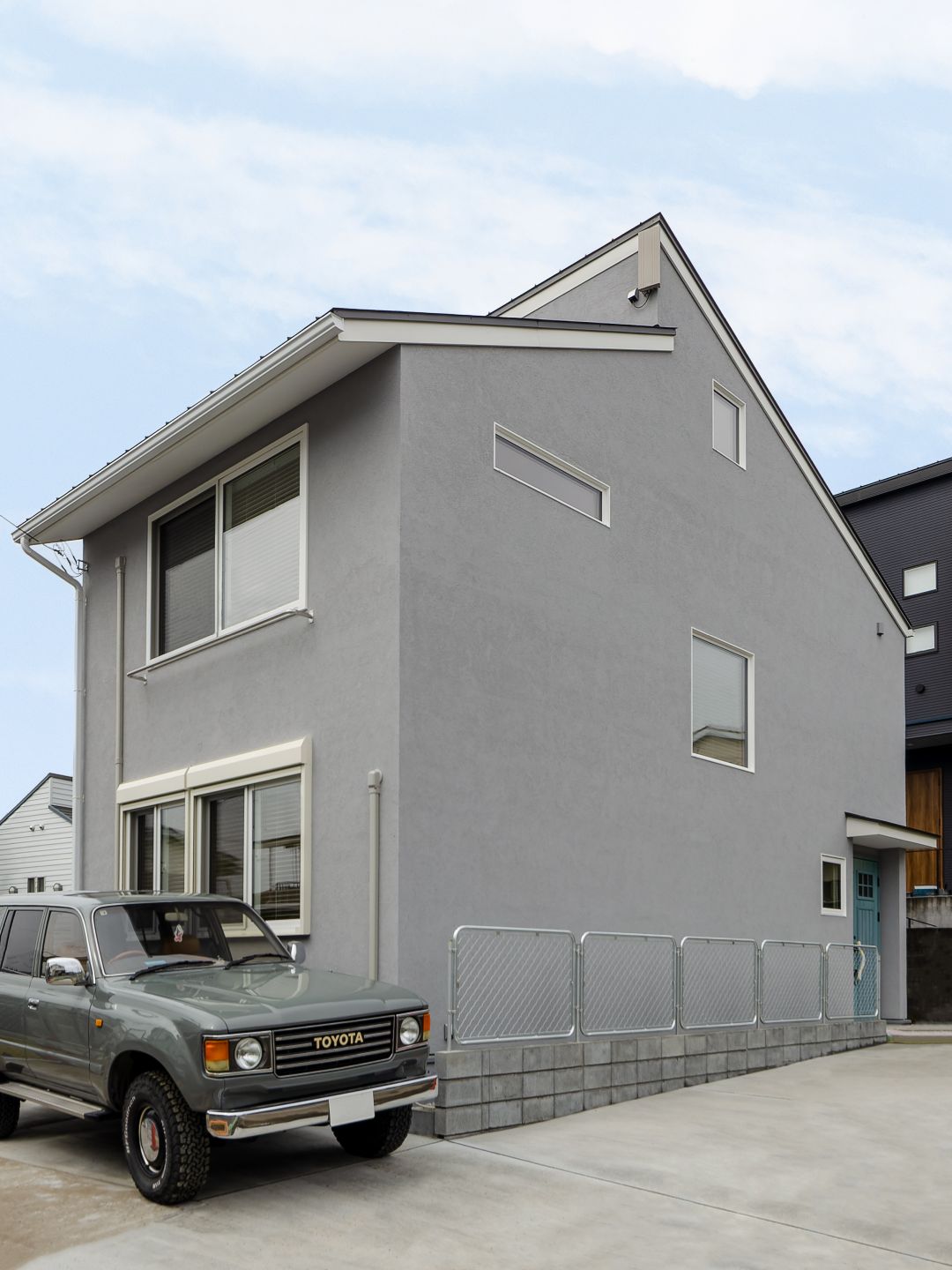 グレーの塗り壁で仕上げたシンプルな外観。インダストリアルな風合いのアメリカンフェンスが印象的です