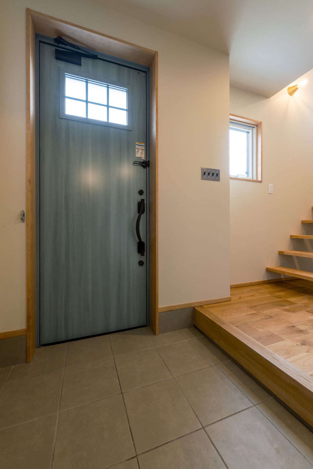 別角度から撮影した玄関。右側はOSB合板で仕上げたウォークインタイプのシューズクロー。廊下の青い引き戸が洗面脱衣室、その奥の水色の引き戸はファミリークローゼットです