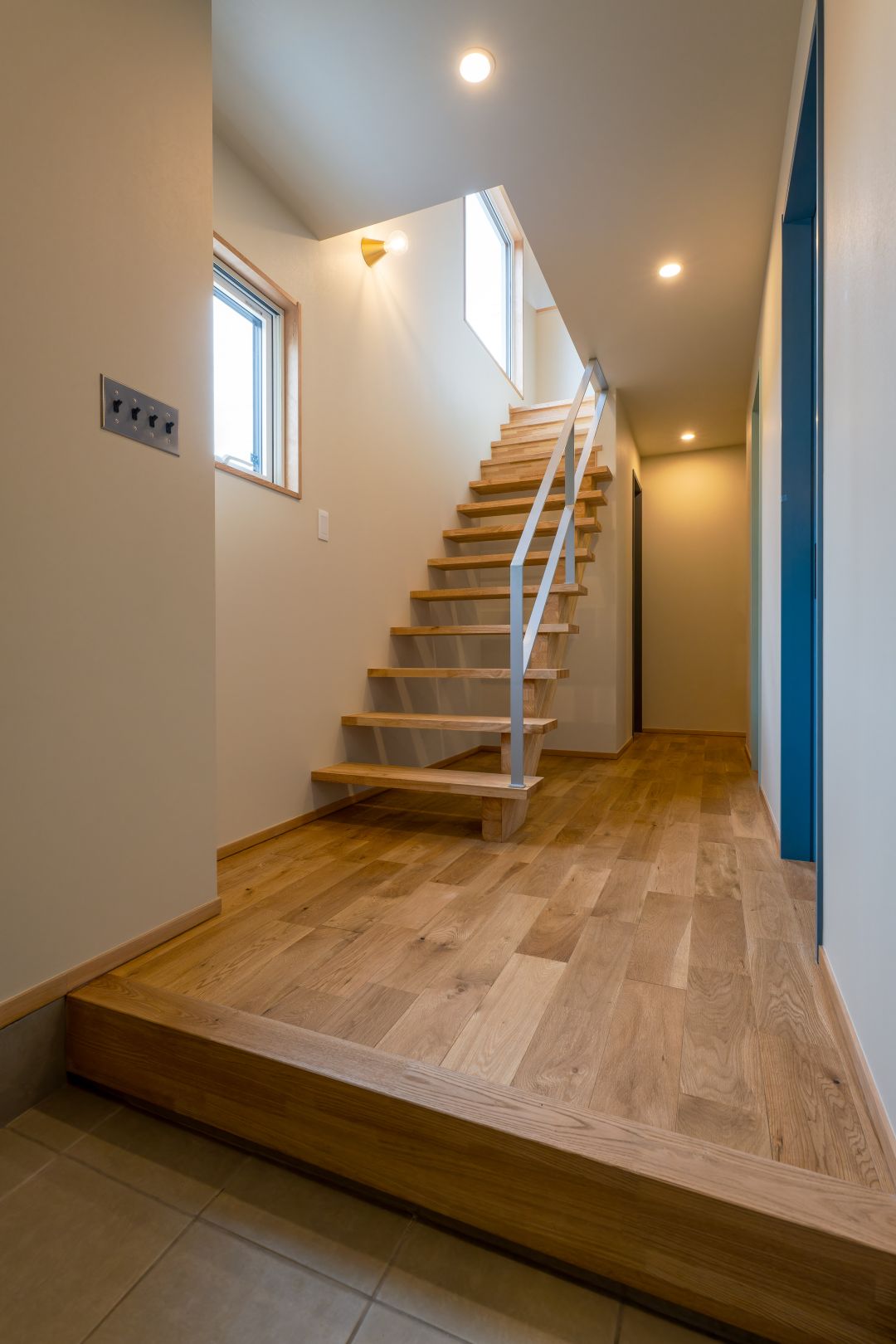 1階から2階への階段。上がりきった正面の壁は耐力壁で、耐震構造上、必要な筋交いは上半分を表しにして圧迫感をなくしています
