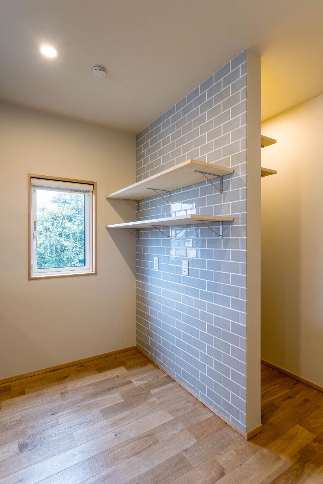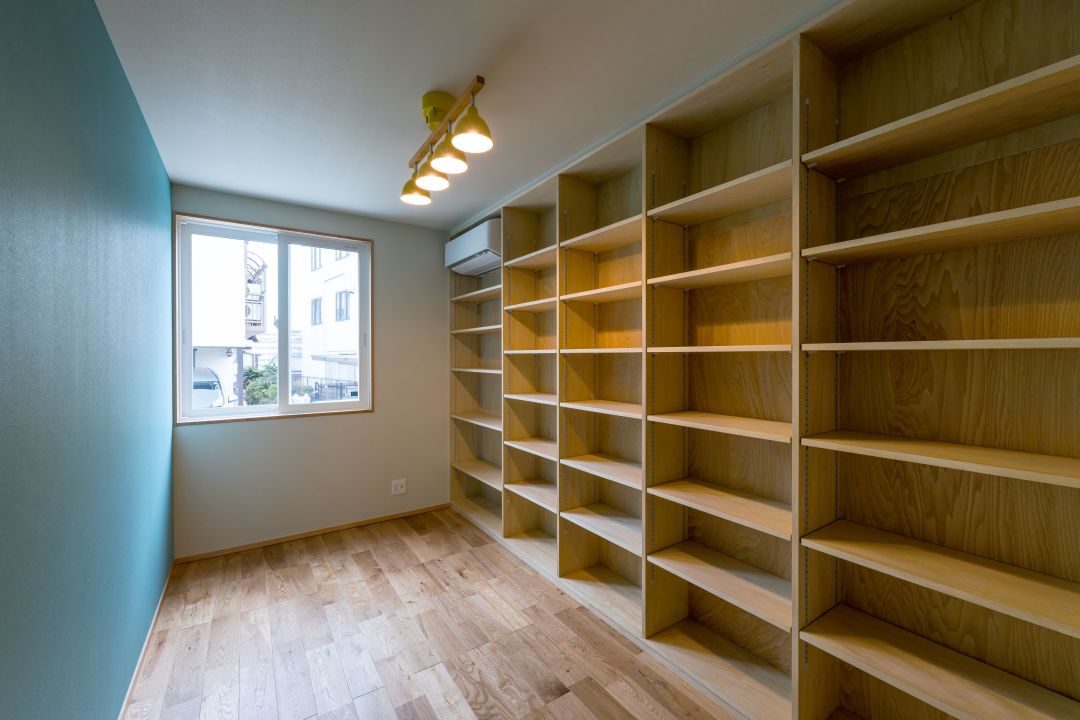 本棚と小物類を飾る収納棚を壁一面に造り付けた、奥様の趣味のお部屋。水色のアクセントウォールが爽やかです
