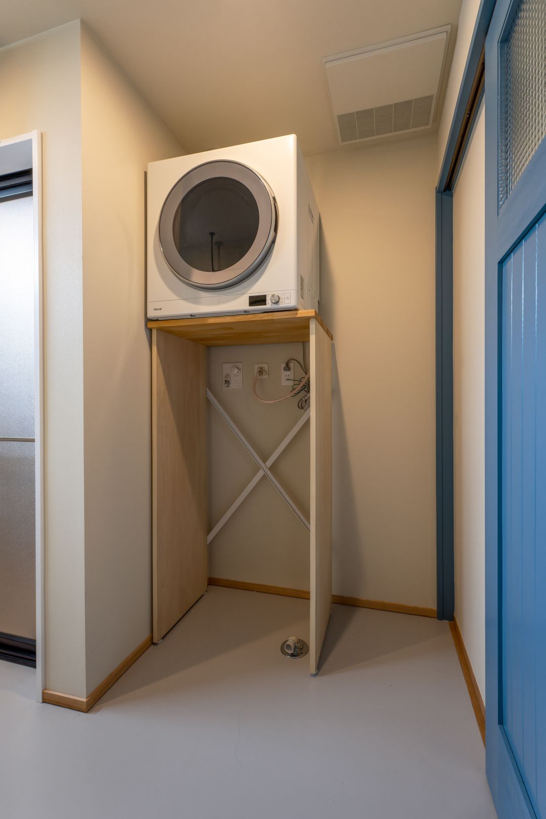 ガス衣類乾燥機「乾太くん」のある洗面脱衣室。乾太くんを置く台は、造作で製作しました