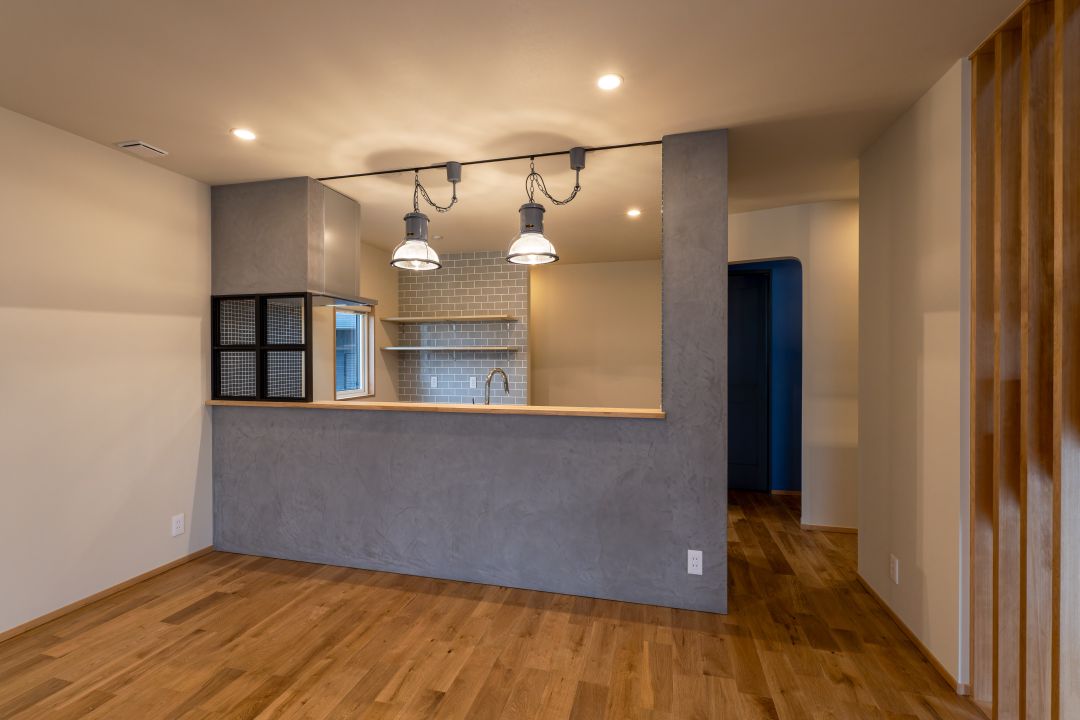 LDKの別角度。上部に設けたデザイン性の高い窓は、リクシルの室内窓「デコマド」