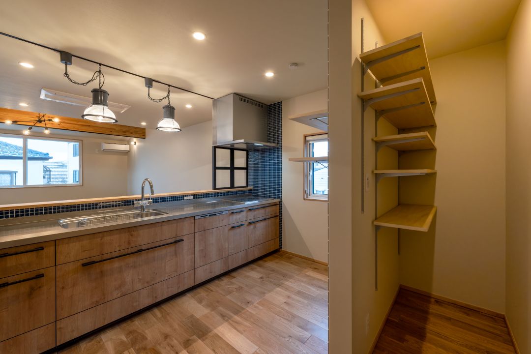 キッチンの後ろにはパントリーを設置。棚は可動式になっています
