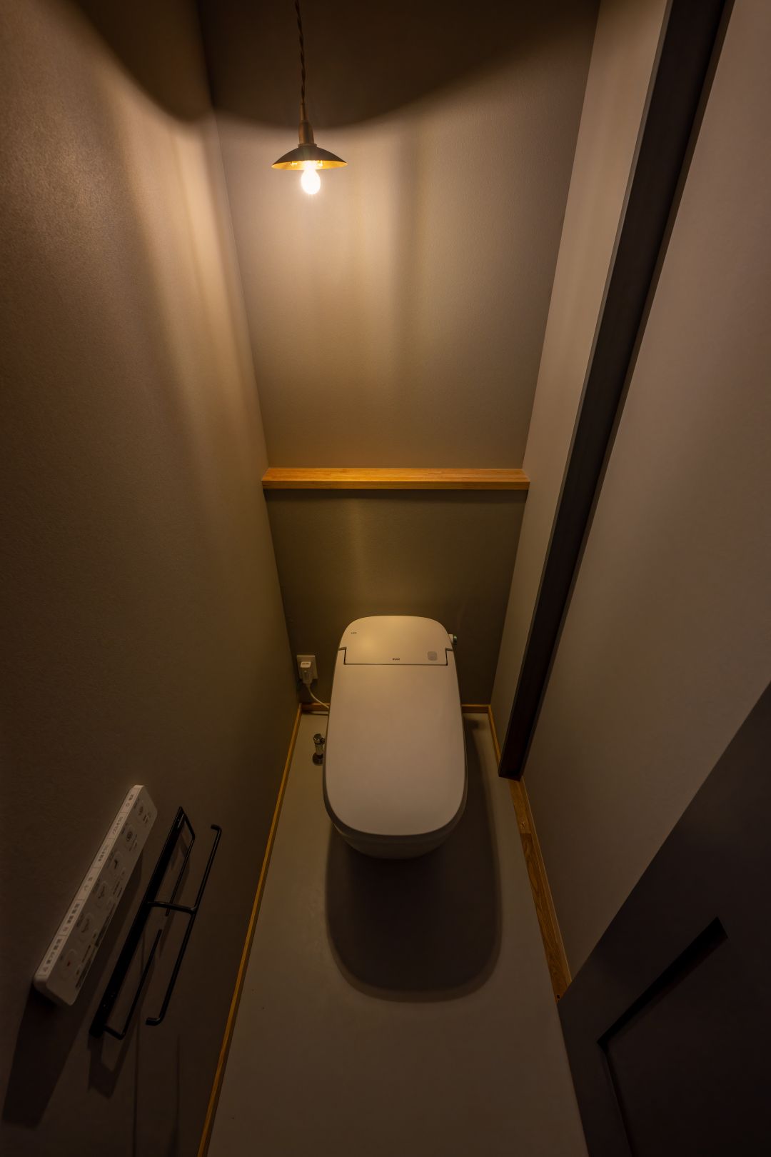 アースカラーの壁がおしゃれな1階のトイレ。収納扉を付けずにオープンな棚を設置しました