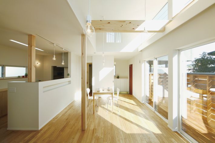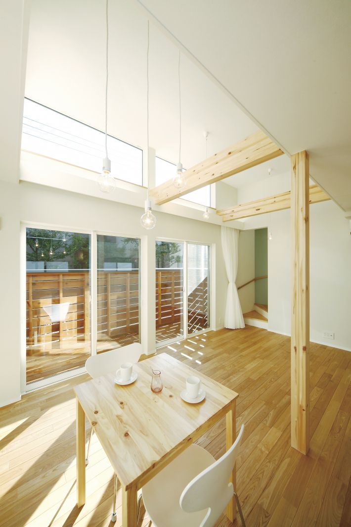 1階LDK。吹き抜けの天井、無垢材のぬくもり、たっぷりの陽光でこの上なく心地よい空間に