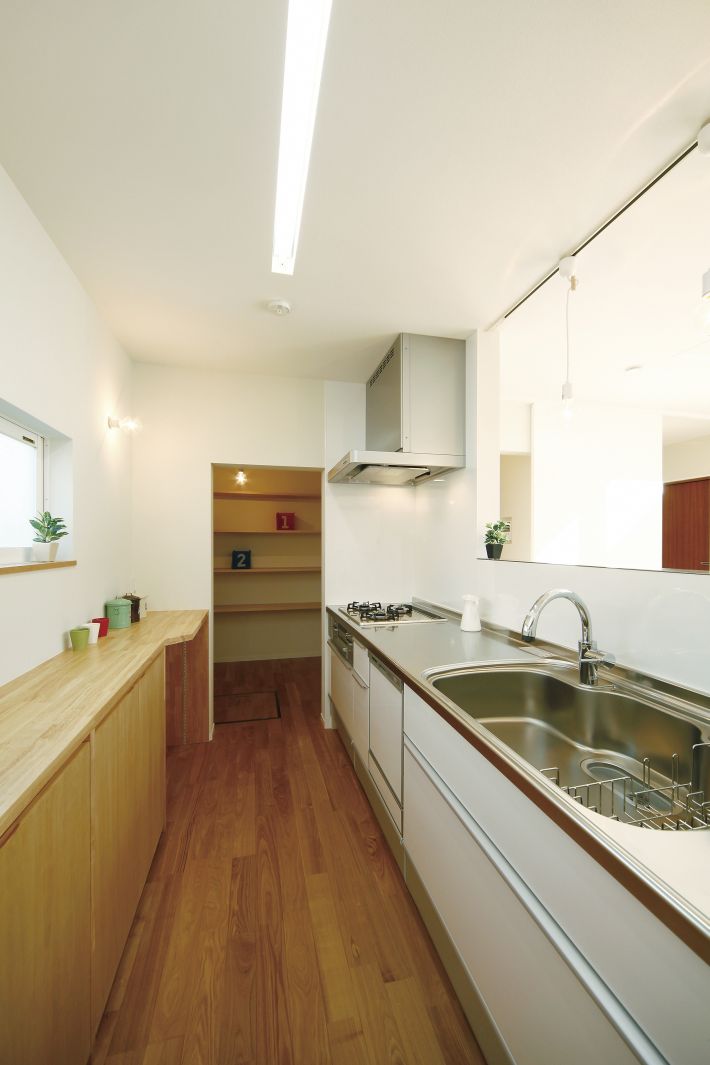 カウンター収納を低くしてすっきりとしたキッチンに。奥は広いパントリーコーナー