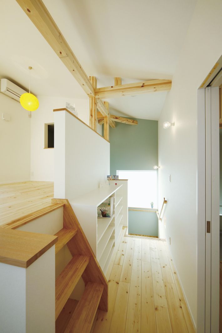 1階から2階へ上る階段の壁にはアクセントカラーを入れて、より明るく楽しい印象に