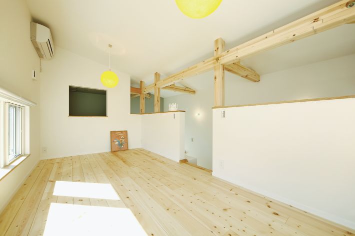 お子様の運動靴と同色の外壁、リビングにはゆるく仕切られたお勉強スペース、秘密基地のロフトに日向ぼっこできるデッキ、泥んこのお洋服も即洗濯・乾燥・収納できる快適な家事動線…。子どもと一緒に暮らしを楽しめる家です。