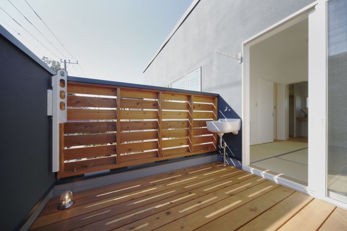 2階の和室からフラットにつながるデッキテラス。1階のテラス同様、外からの視線に配慮し塀は高めに設置することで、プライベートな空間に