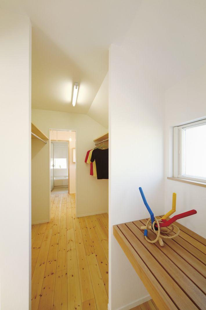収納ルームからのアングル。収納→クローゼット→洗濯・洗面→バスルームと一直線でつながります
