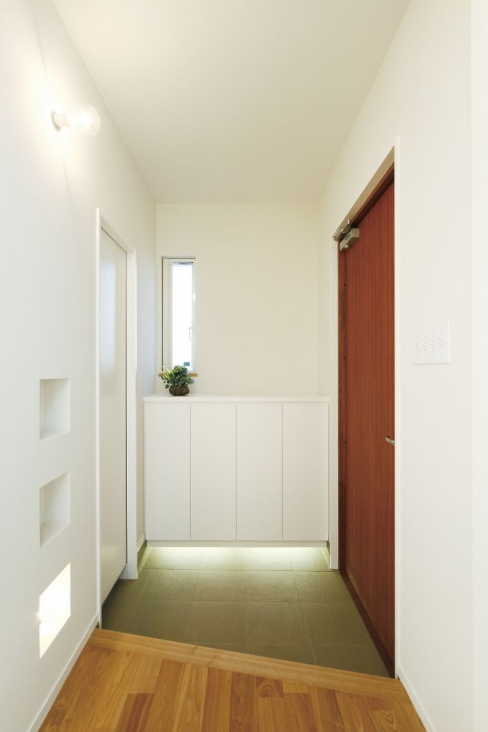 すっきりとした明るい玄関。土間の壁にはスリット窓、足元には収納下の明り取り窓、室内のニッチには間接照明など光をデザインしています