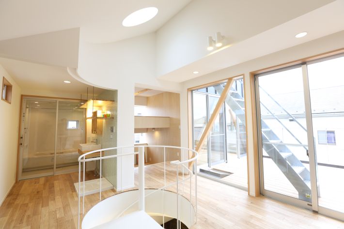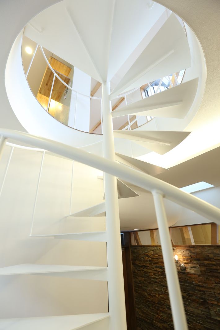 家の中心に配置した、らせん階段。デザインとしての存在はもちろん、採光などの機能的な役割も担っています