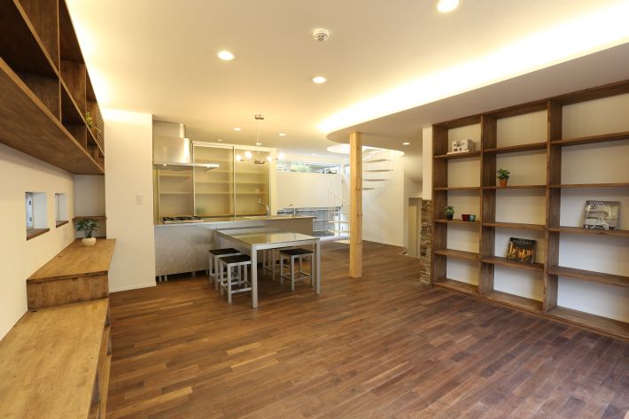 1階LDK。窓のない三方の壁には、それぞれのシーンを想定してピッタリの壁面収納を造作しました