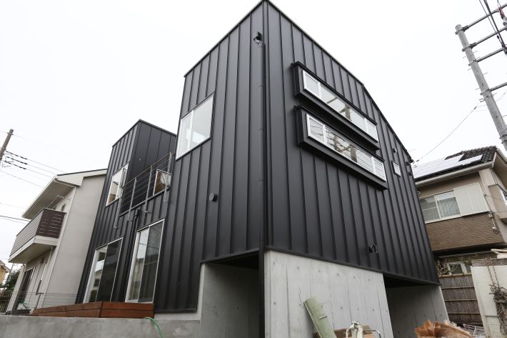 ガルバリウムの外壁と出窓で、引き締まった印象の外観。湿気にも強く、通路からの視線も遮ってくれる高基礎にしてあります