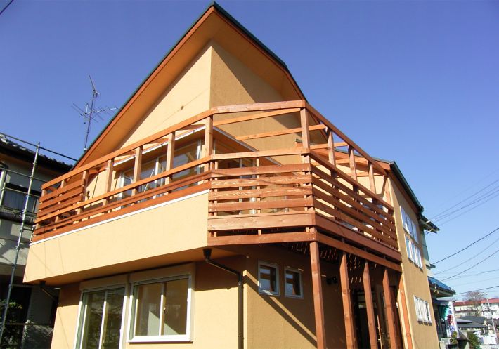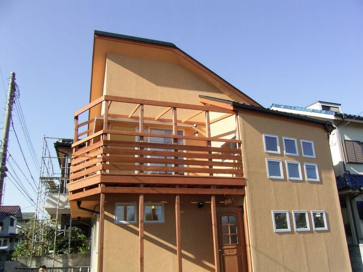 前面をぐるりと囲むようにテラスを配置した、ウッディな印象の外観。外壁は、デザイン性と耐久性に優れたジョリパットを採用しています