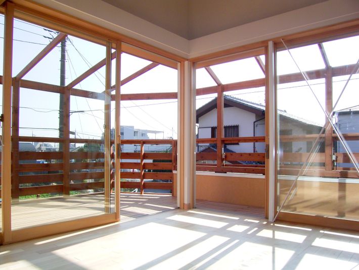 2階リビングからの風景。輸入サッシで屋外のテラスと一体化したような大開口が実現しました