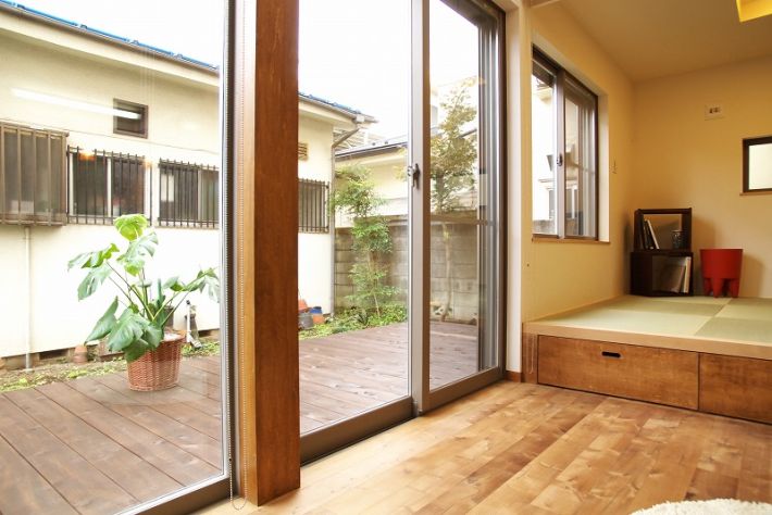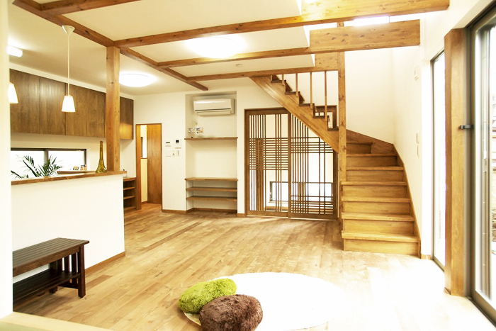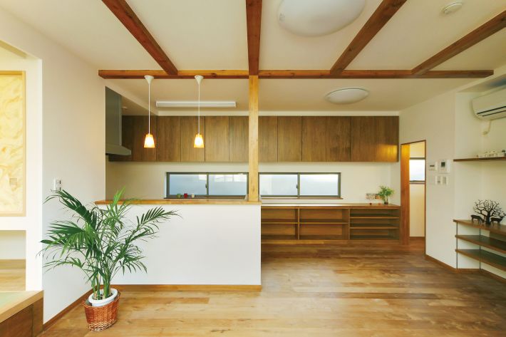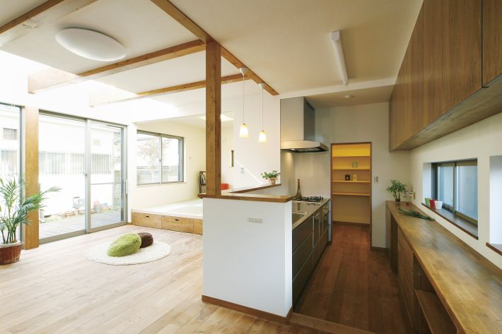 南方に風が通るさわやかな1階LDK。燻したバーチ床材に合わせて柱や梁を飴色に塗装し、温かみのある印象に。小上がりの畳スペースはご家族の憩いの場です
