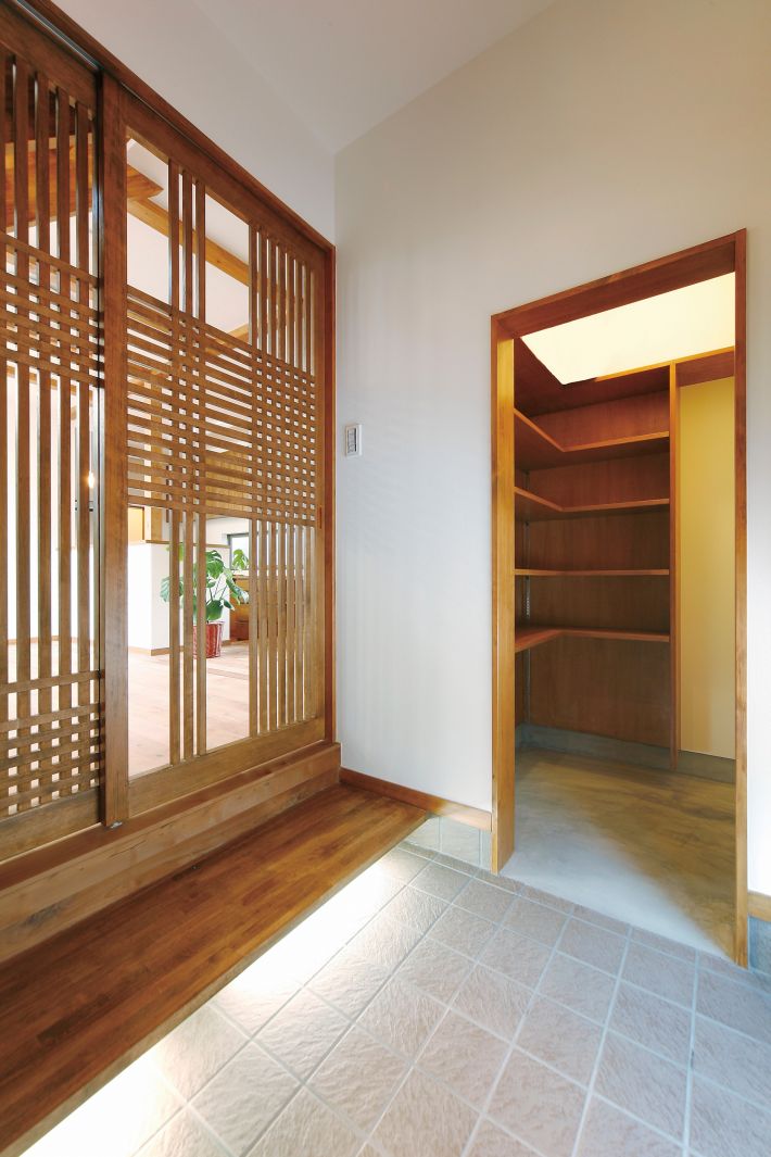 右側は大型収納付きの玄関、左はリビングへ。格子デザインの建具はオリジナルで制作しました