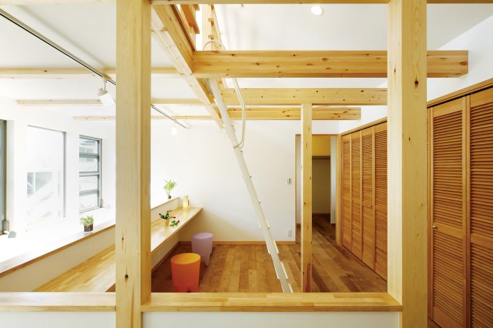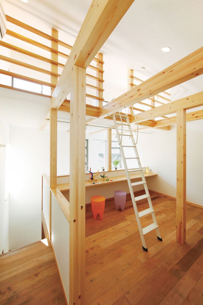 2階の吹き抜けに面したスタディスペース。白い階段の上は、将来子ども部屋にする予定のロフト。