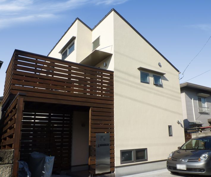 シャープなフォルムに天然木の塀が温もりあるアクセントになっている外観。2階のウッドデッキは高い塀が目隠しとなり、洗濯物も気兼ねなく干せます