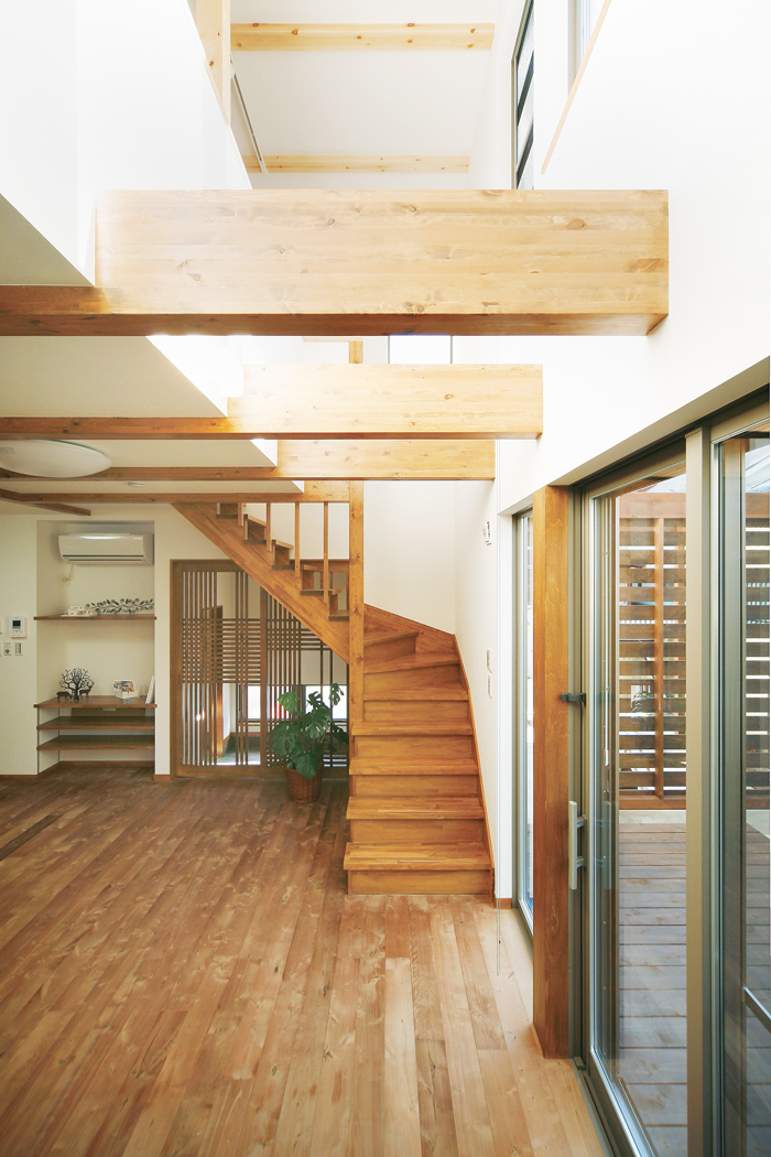 リビング階段と吹き抜け部分。2階は梁や柱・建具をナチュラルカラーでまとめ、上下階の空間に変化をつけています