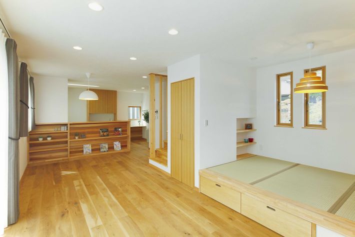 LDKの一角には小上がりの畳スペースを配置。下は収納スペースとして活用しました