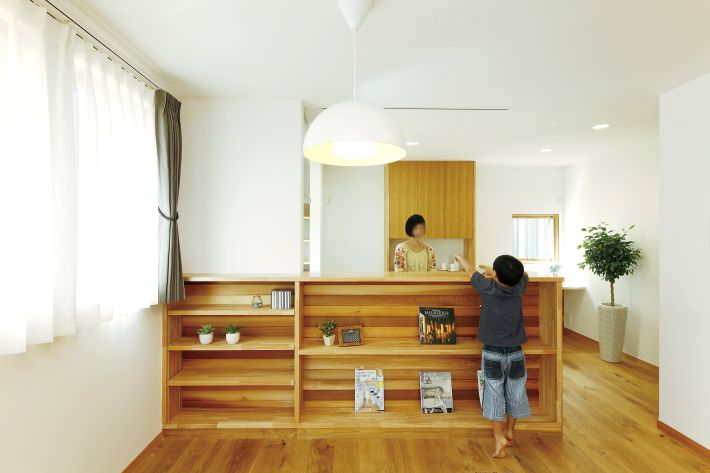 壁のサイズに合わせて作ったキッチン収納で、空間がスッキリ。右奥のカウンターはお子様の勉強机としても活用できます