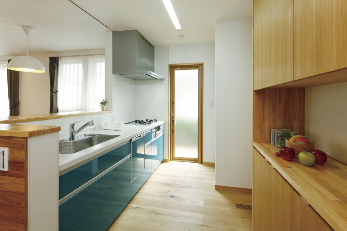 ターコイズブルーのさわやかなシステムキッチンをセレクト
