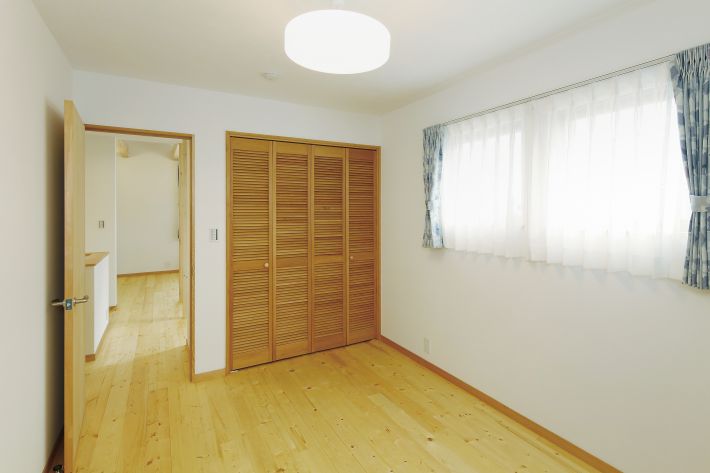 2階の明るい洋間はご夫婦の寝室。温もりのある無垢の折れ戸を開けると収納力のあるクローゼット