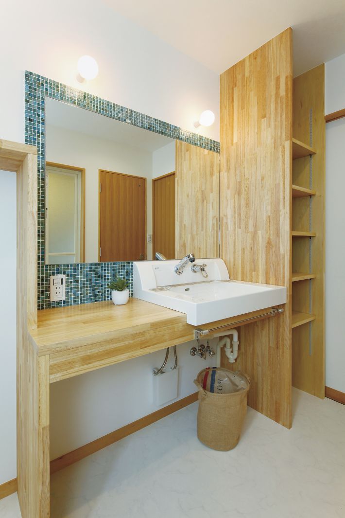 システムキッチンの色と同色のターコイズブルーのモザイクタイルが印象的な洗面台