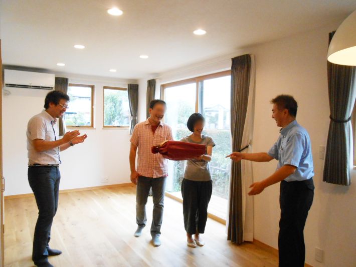 お引き渡し時にリビングにて記念品を贈呈。ちなみに右が小野寺社長、左が設計士さんです