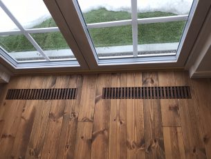 ここのお家ではダクトの1本を2Fのホールまで持ち上げ、1フロアだけはなく2階にも暖気を、と試みているところ。